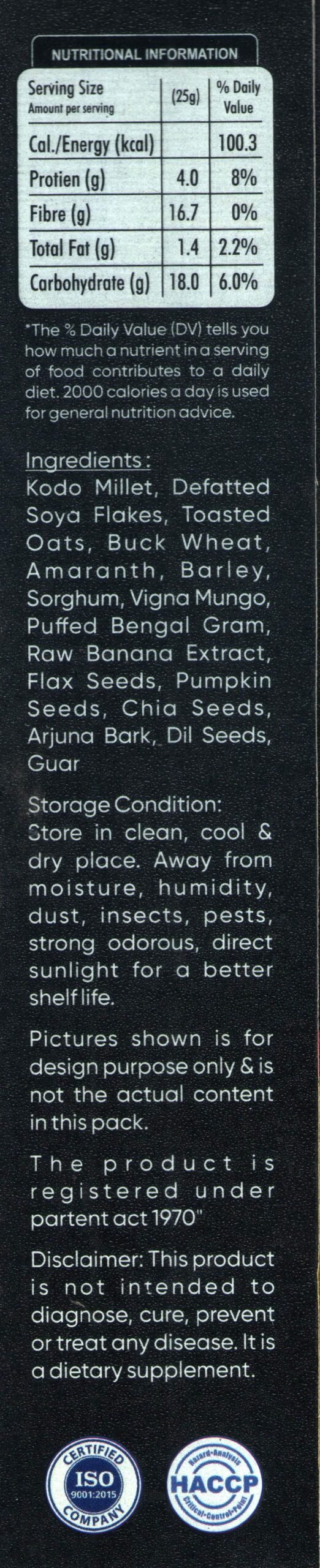 Whole wheat, oats, jowar, bajra, ragi, flaxseed, barley, and natural herbs. (Exact composition may vary; check pack for details.)Storage: