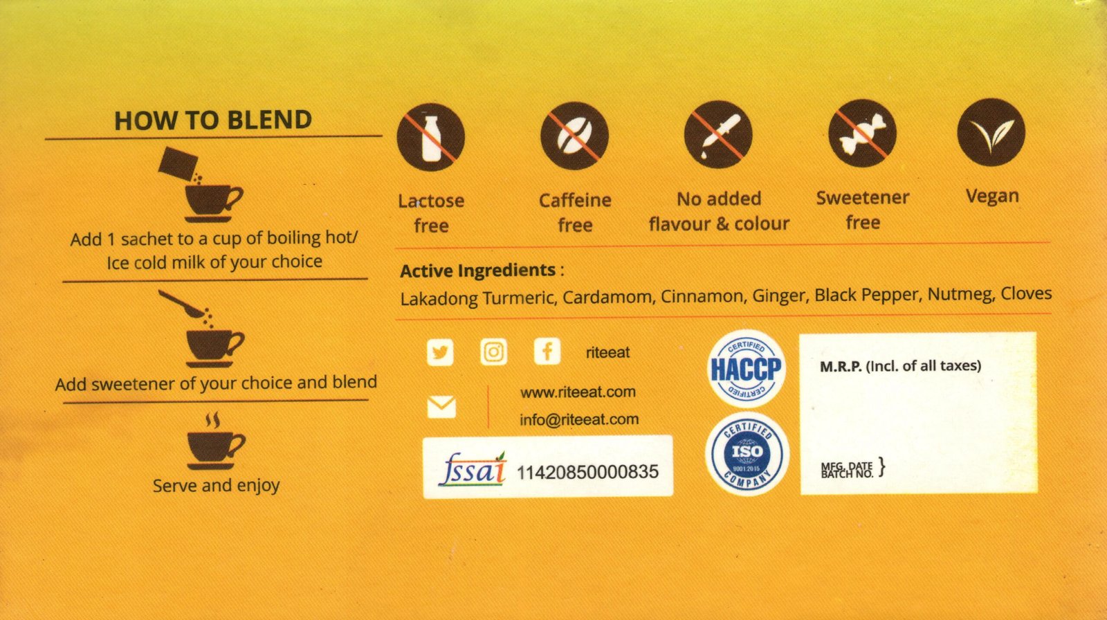 RiteEat Golden Turmeric Latte is a traditional wellness blend inspired by Ayurveda. We’ve combined premium turmeric, warming spices like cinnamon, ginger, and a whisper of black pepper to increase curcumin absorption. Perfect mixed with milk (dairy or plant-based) for a creamy, comforting drink.