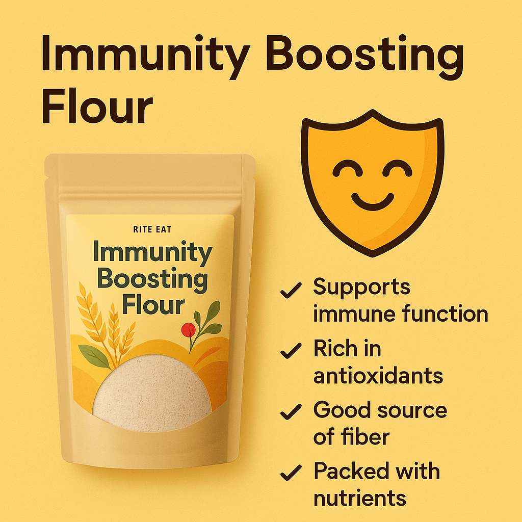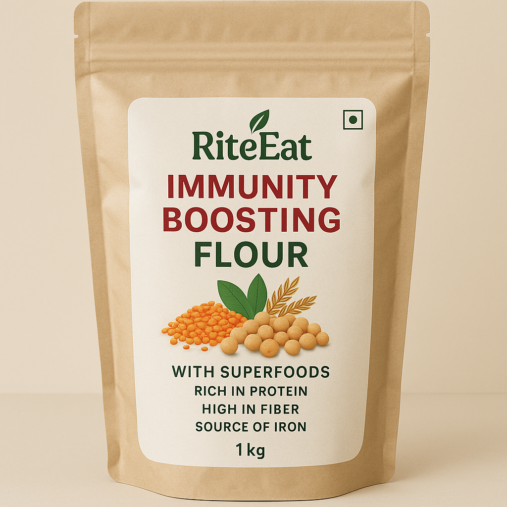 RiteEat Immunity Boosting Flour is specially formulated to help strengthen your body’s natural defenses. This flour combines immune-rich millets and grains like ragi, foxtail millet, mung dal, and flaxseed to deliver vital vitamins, antioxidants, and fiber.Whether you use it for rotis, porridges, pancakes, or baked goods, this blend enriches your meals with nutrients that support immunity and overall wellness.